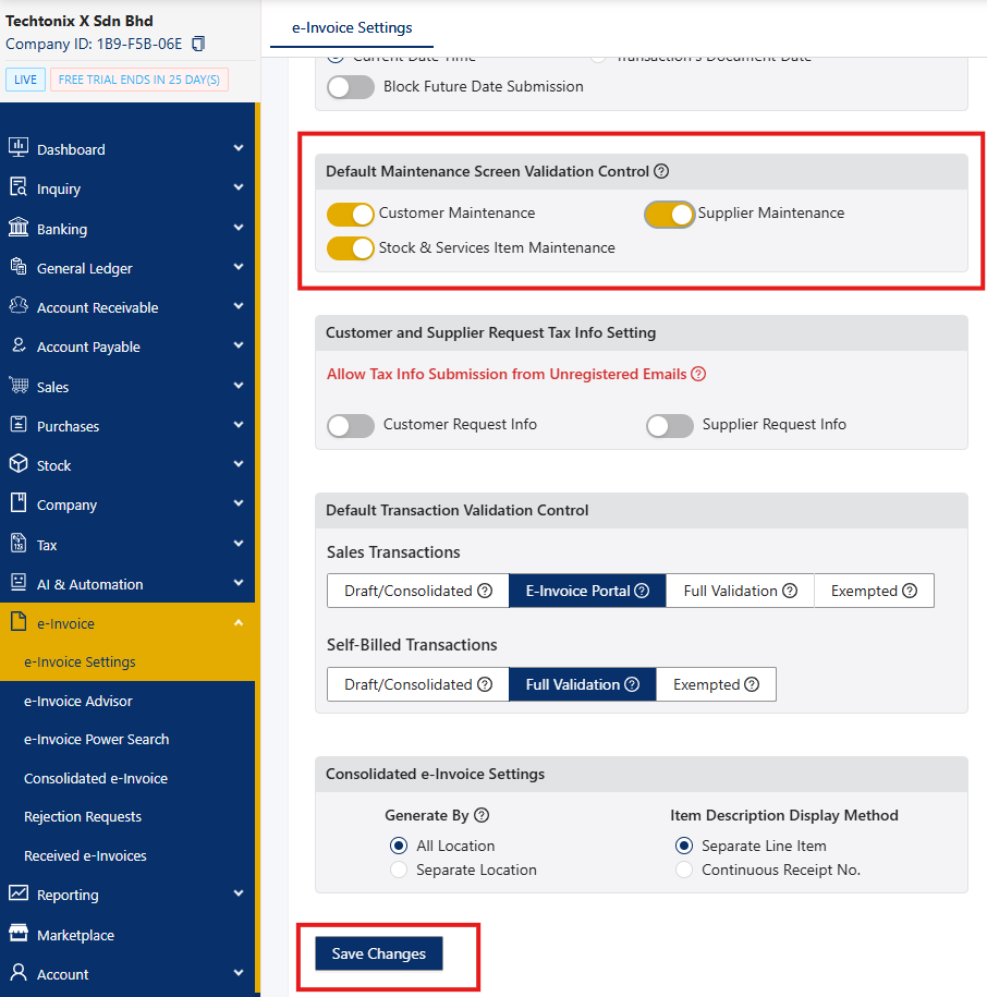 c. Stock & Services Item Maintenance - Ensures that product/service master records used on e-Invoices include valid description and classification information.