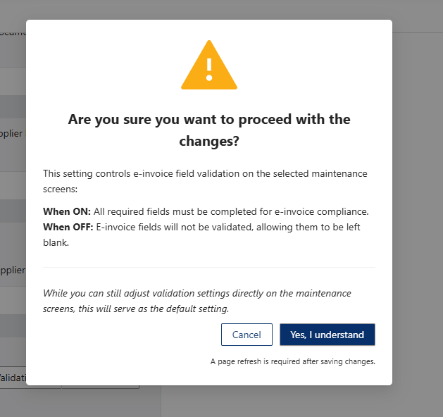This setting is configured under the General tab of e-Invoice Settings and helps ensure that critical e-Invoice-related information is captured early—before invoices are created or submitted—thereby reducing submission errors and rework.
