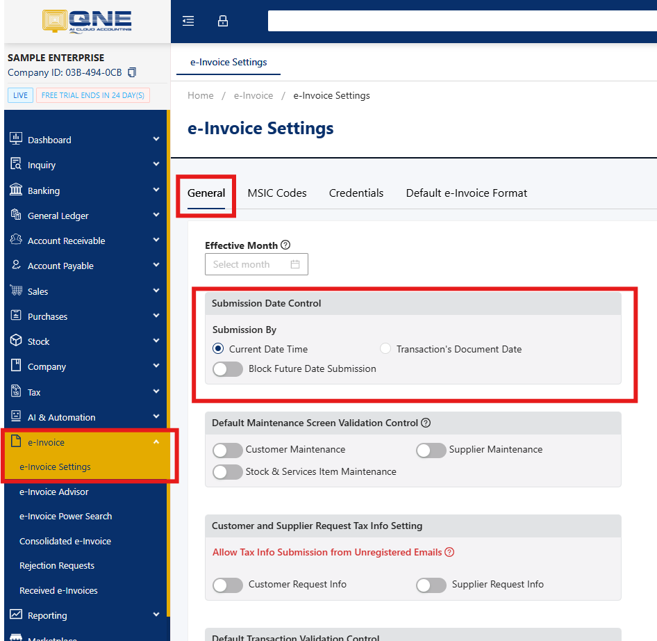 When using QNE AI Cloud Accounting with this setting, the Block Future Date is automatically applied (means you cannot submit an e-Invoice. the Document Date determines the valid submission window for an e-Invoice. An e-Invoice may be submitted from up to 3 days before the Document Date, and no later than the Document Date itself.