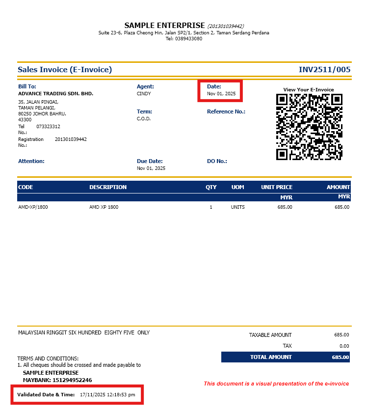 The invoice may be dated earlier, but MyInvois records the real submission time.