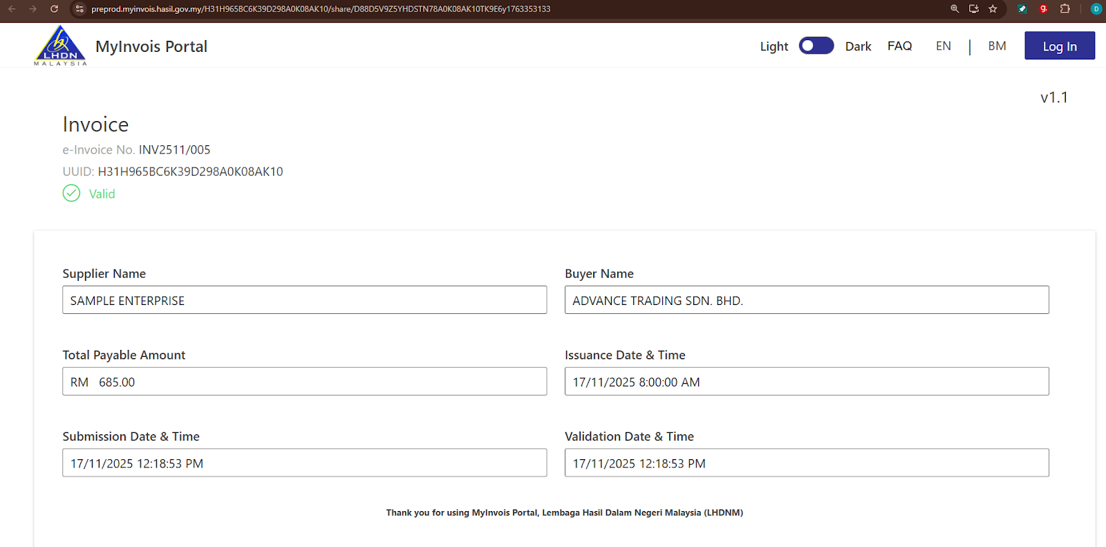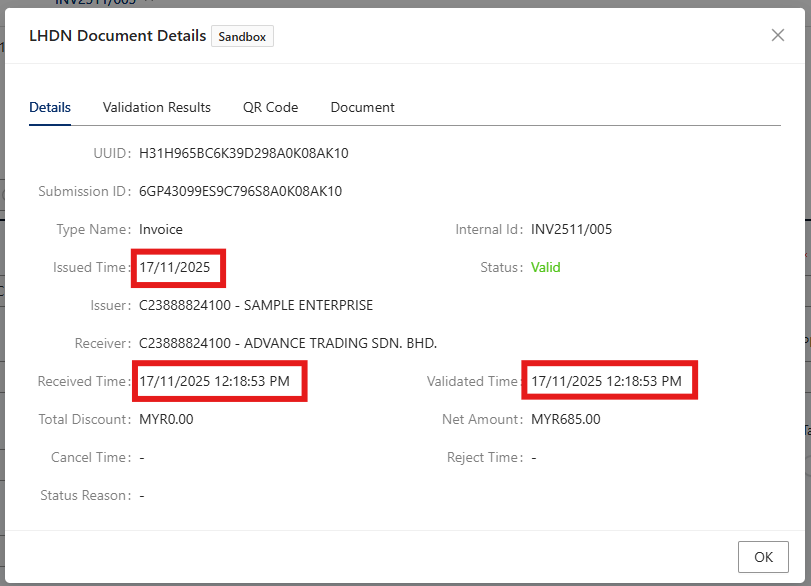 The document was created on 1st of November 2025, but in the LHDNM record, the document is validated based on the current date and time of submission.