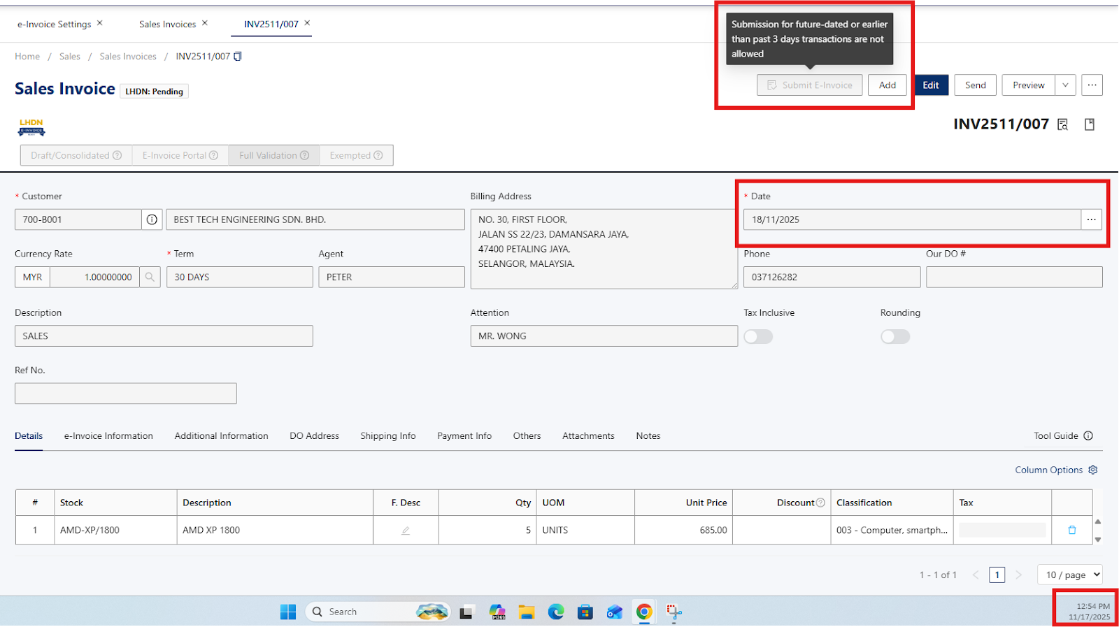 The system will block the “Submit E-Invoice” button from being able to click, with an error prompts “Submission for future-dated or earlier than past 3 days transactions are not allowed”.