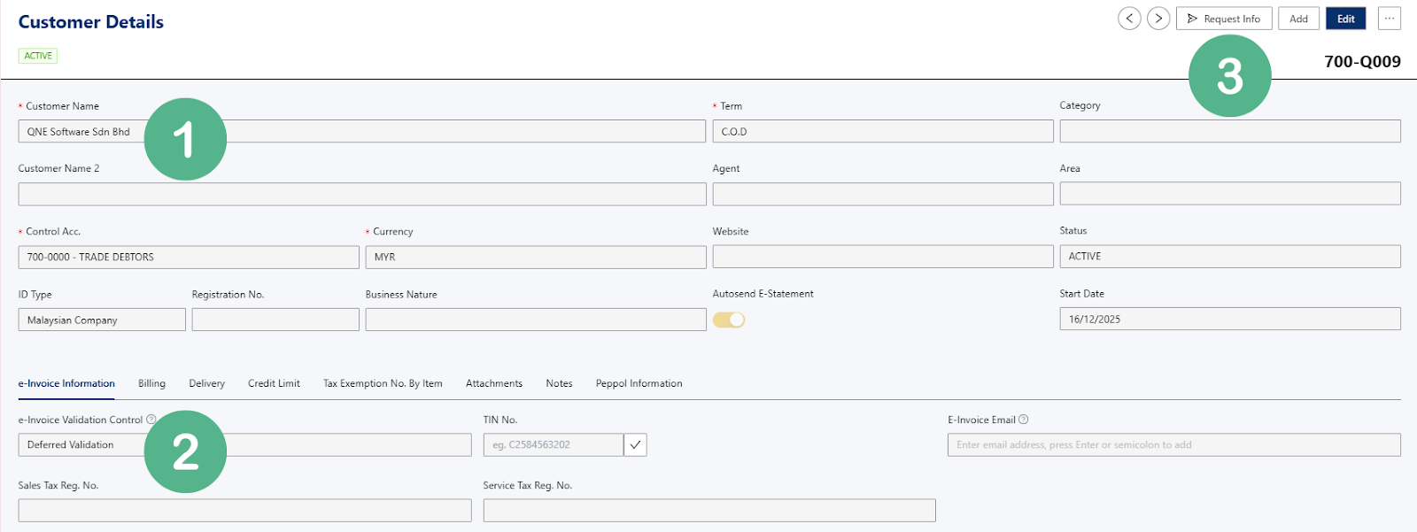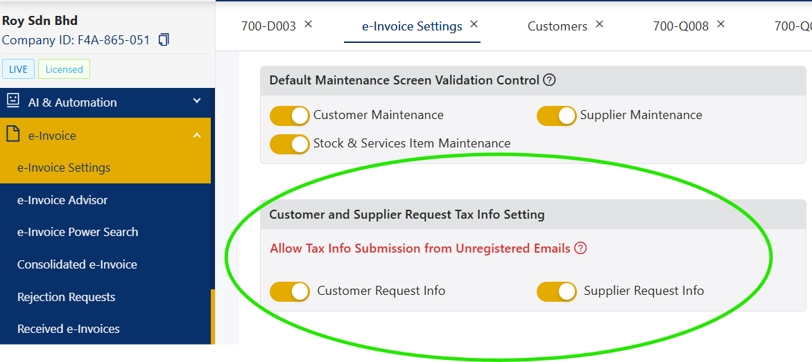 By enabling the Customer and Supplier Request Tax Info setting, customers can submit their company tax information later using any email address, not just the email captured in the customer maintenance. This allows finance or admin teams to complete e-Invoice details even if the original buyer does not have the correct information on hand.