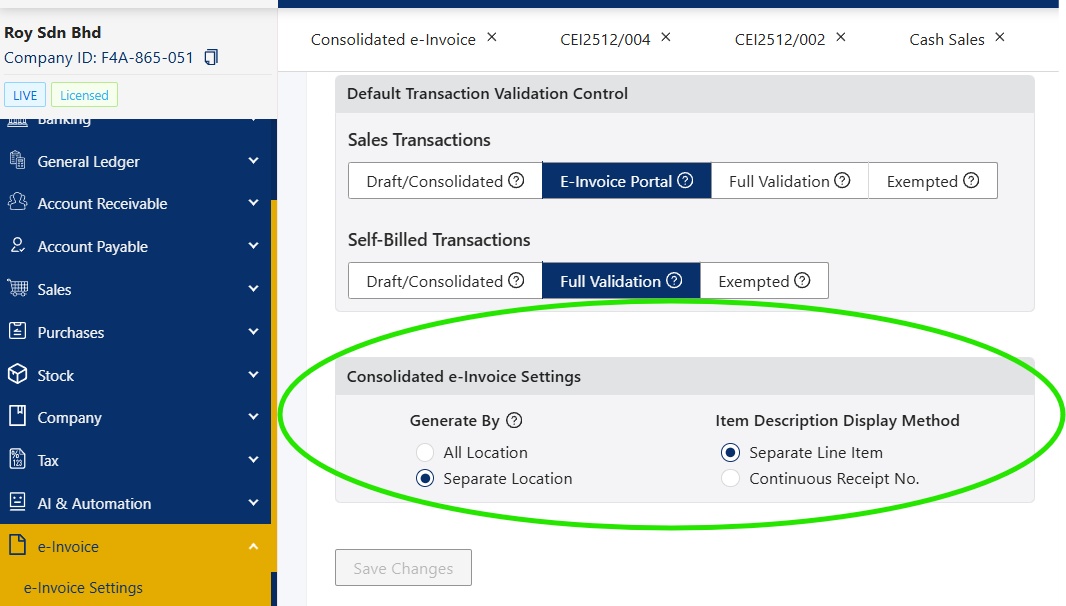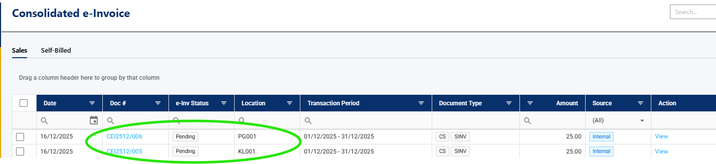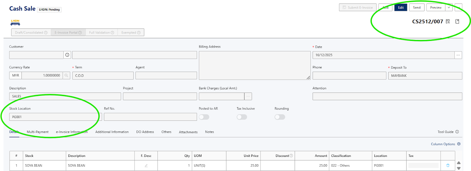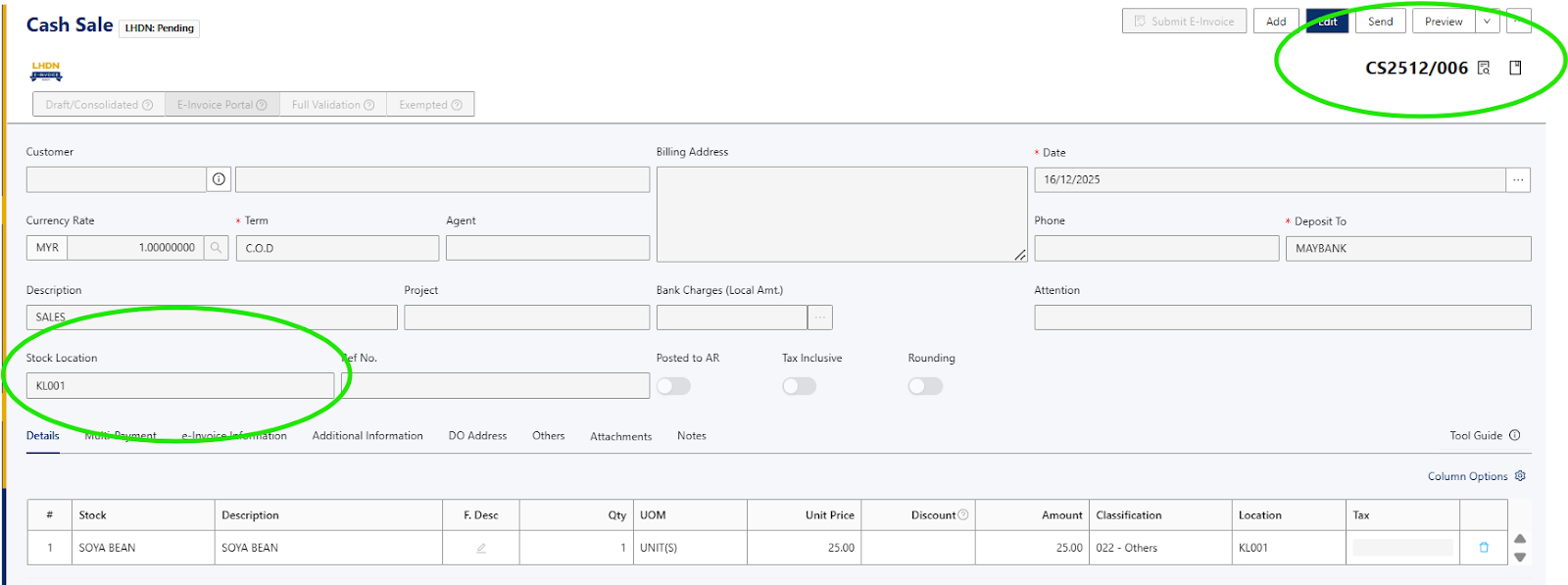 Make sure to select the correct location code for each transaction so that the consolidated e-Invoice is generated separately by stock location, in compliance with LHDN requirements.