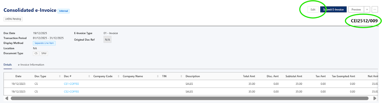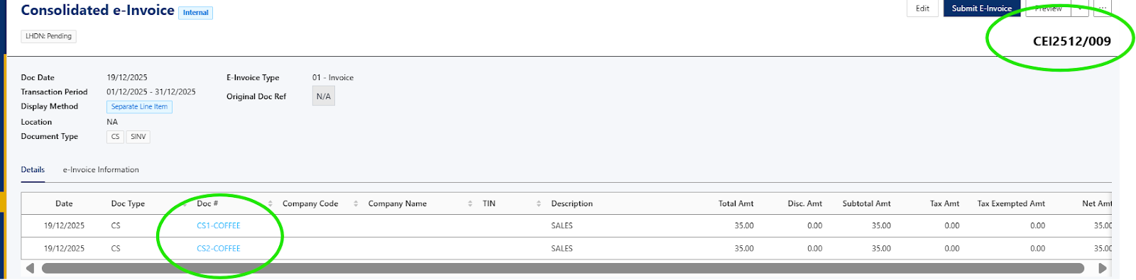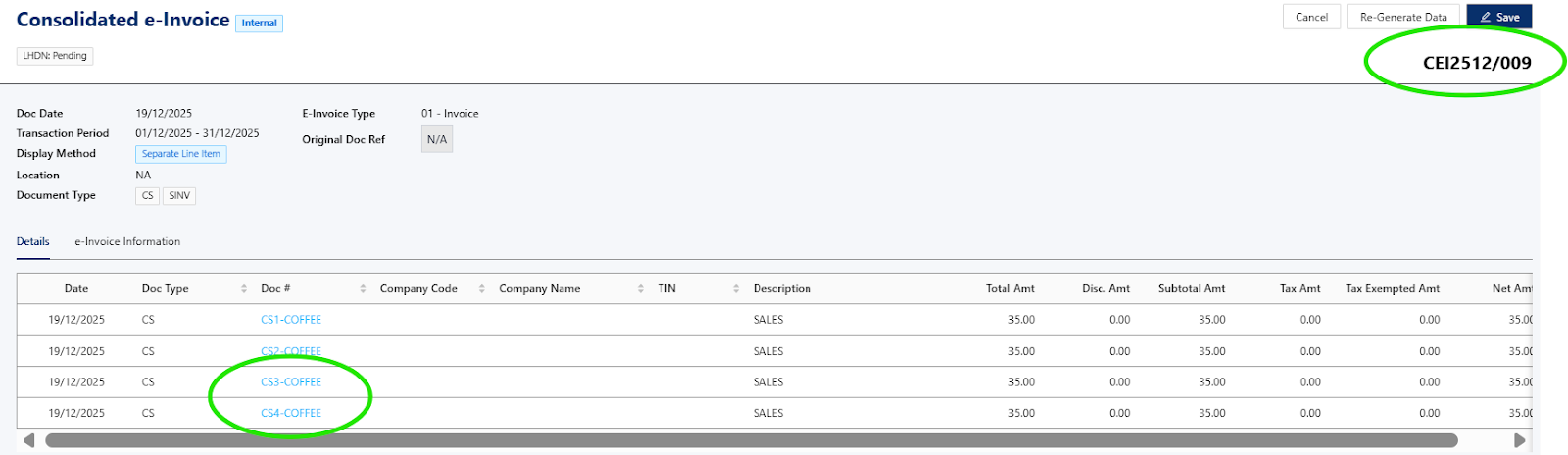 After regeneration, CS3-COFFEE and CS4-COFFEE will be added to the consolidated e-Invoice together with the earlier transactions. You can then proceed to submit CEI2512/009 and remain compliant.