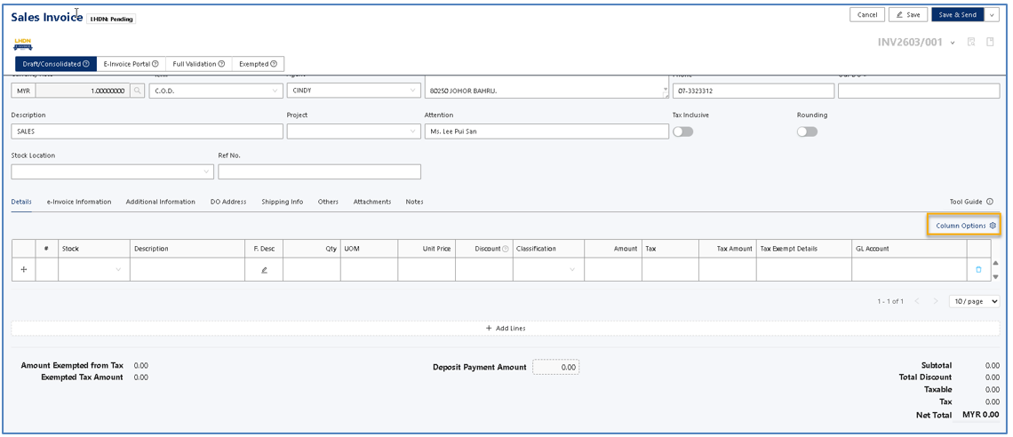 2. In Sales Invoice, by default there are no additional columns for “Rental Exempted Rate” or “Rental Exempted Tax Amount” , click on “Column Chooser”