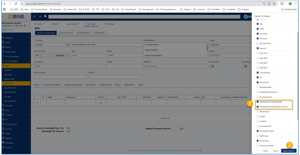 To display the relevant columns, Tick “Rental/Lease Exempted Rate” and “Rental/Lease Exempted Tax Amount” > Apply Options.