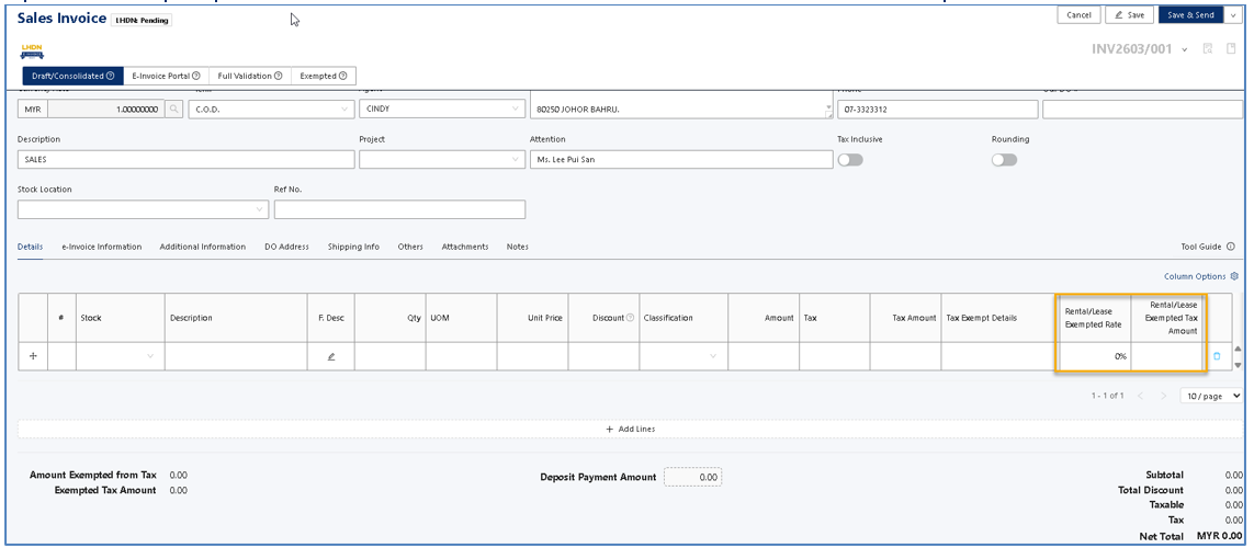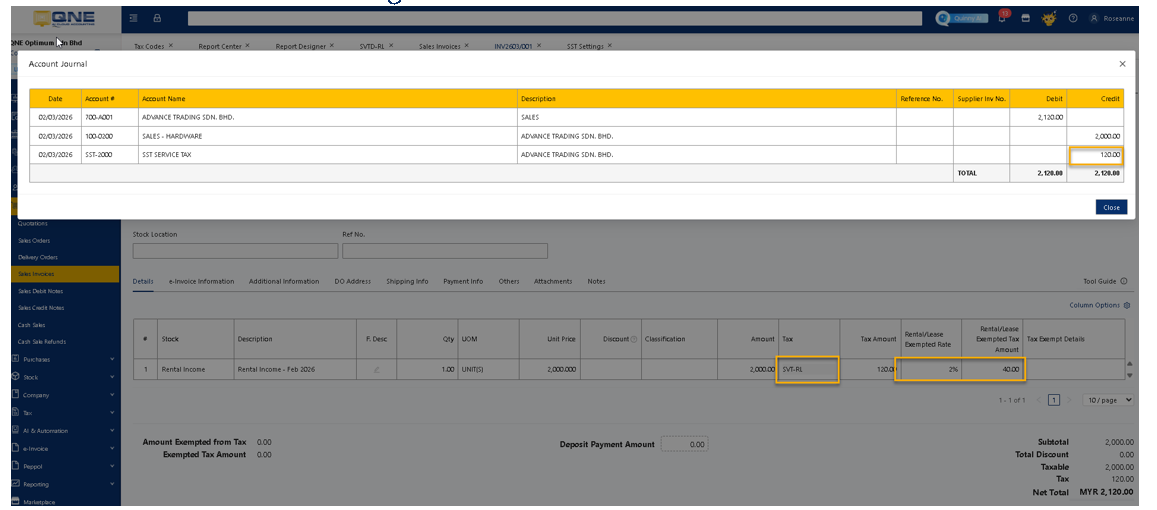 3. When user create the Sales invoice and select the tax code “SVT-RL” system will automatically calculate the exempted of 2% and amount. Notice that service tax charged based on 6%