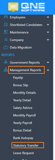 1. After logging in to QNE Cloud Payroll, navigate to Reports > Management Reports > Statutory Transfer